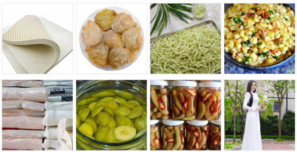 - Những loại lương thự, thực phẩm đã chế biến như rau củ quả, bánh kẹo, mứt các loại, khô các loại, đậu, hạt các loại, yến sào, tỏi đen, chà bông, tinh bột