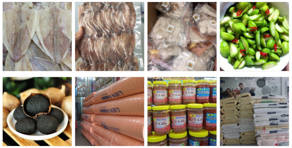 - Hạt các loại, rau củ quả sấy,  mắm tôm, mắm tép, mắm cá khô, tinh bột, bột nghệ, yến sào, tỏi đen, chà bông, bánh kẹo, mứt các loại, khô các loại, đậu.