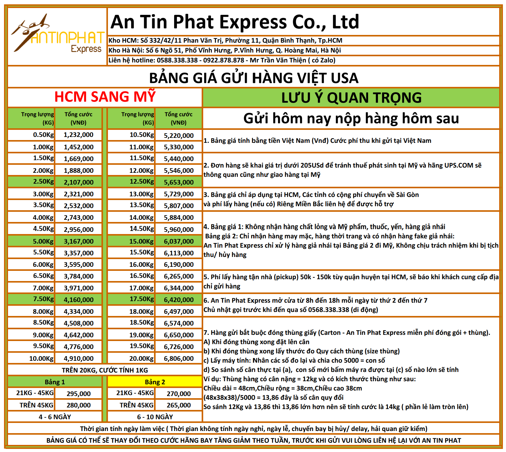 An Tin Phat Express cung cấp bảng giá dịch vụ gửi hàng đi Mỹ gồm:
