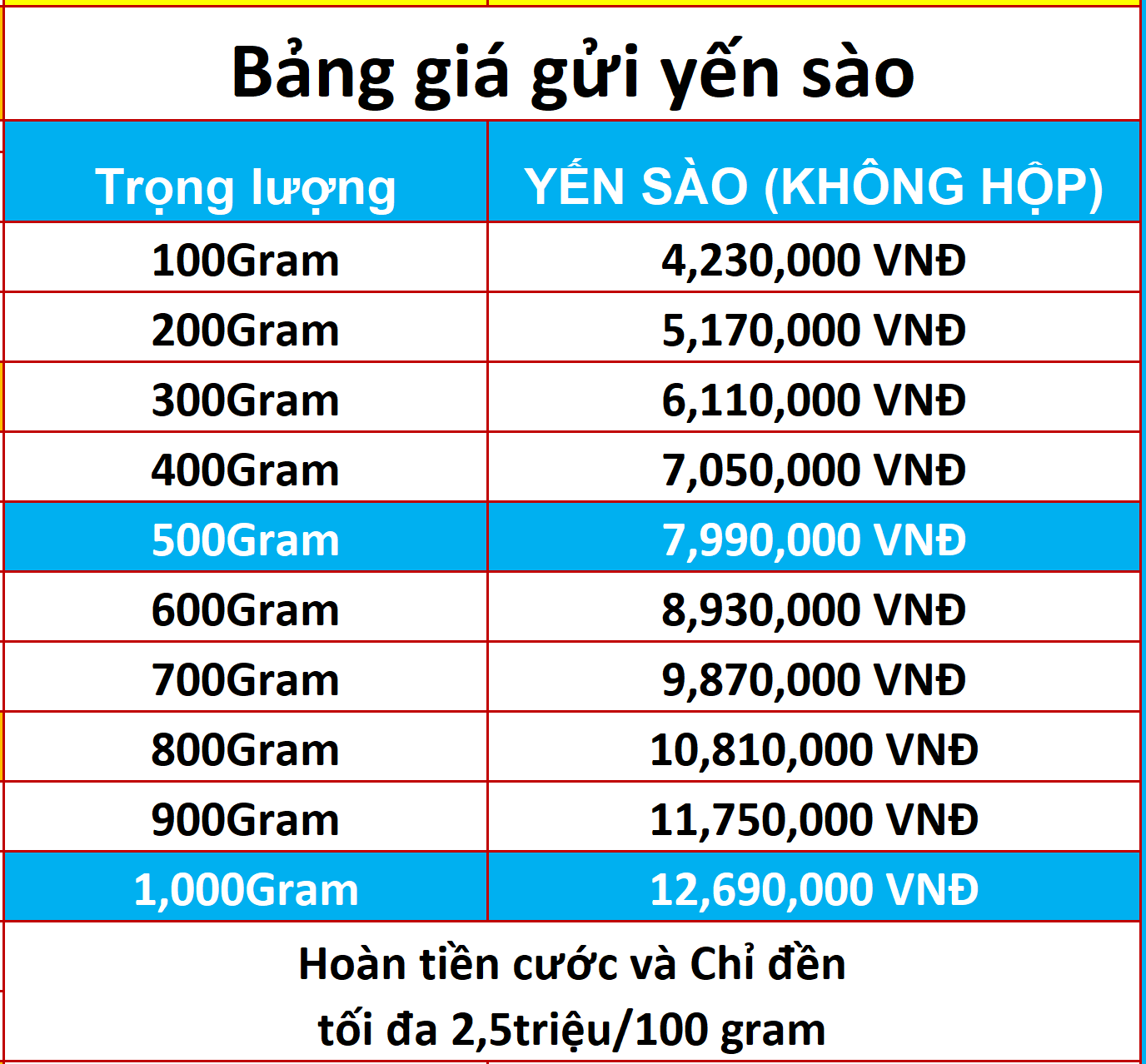 - Bảng giá cước gửi yến sào đi Mỹ này sẽ đền bù tối đa 2,500,000đ/100gram dù giá trị yến có cao hơn hay thấp hơn
