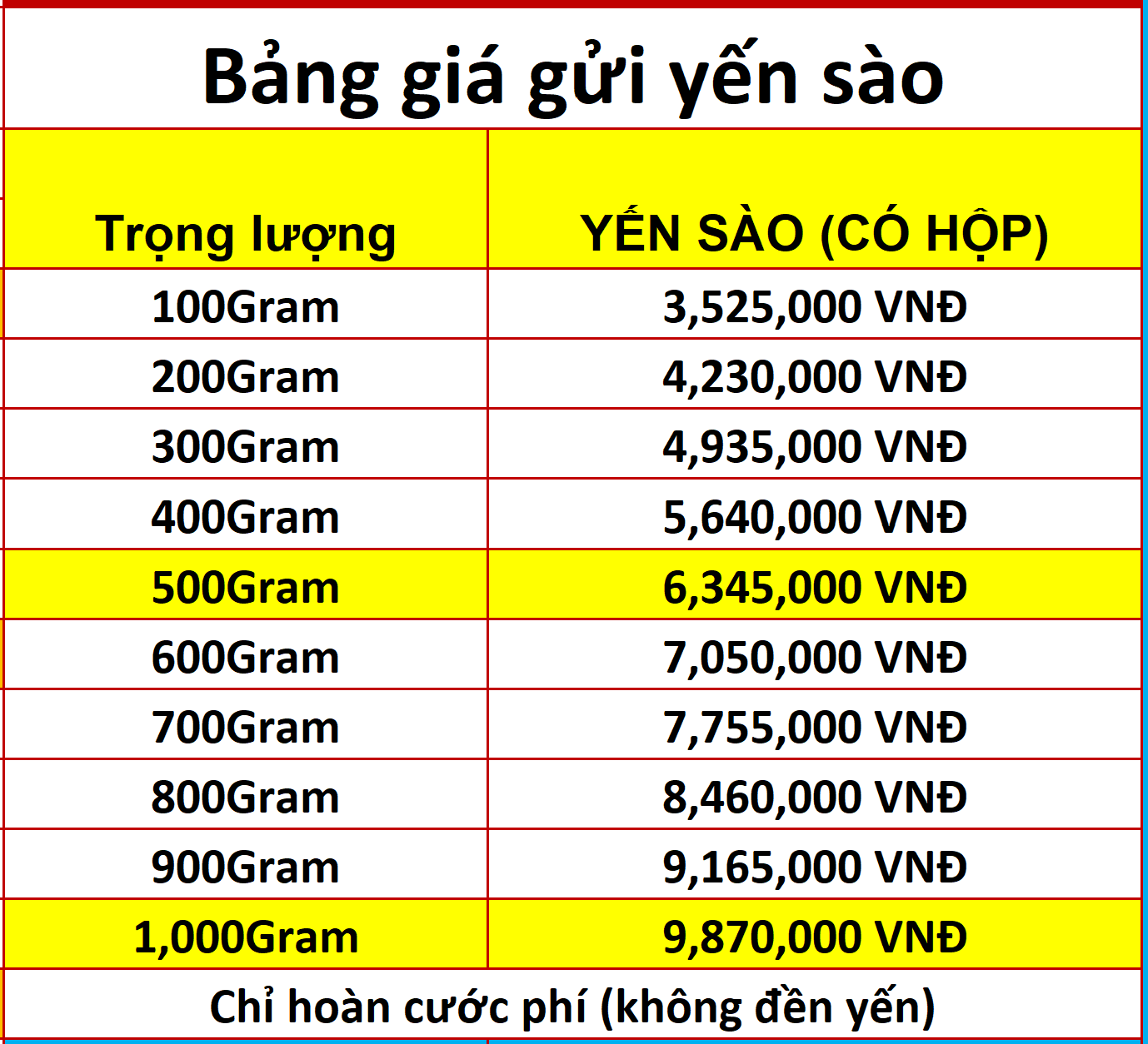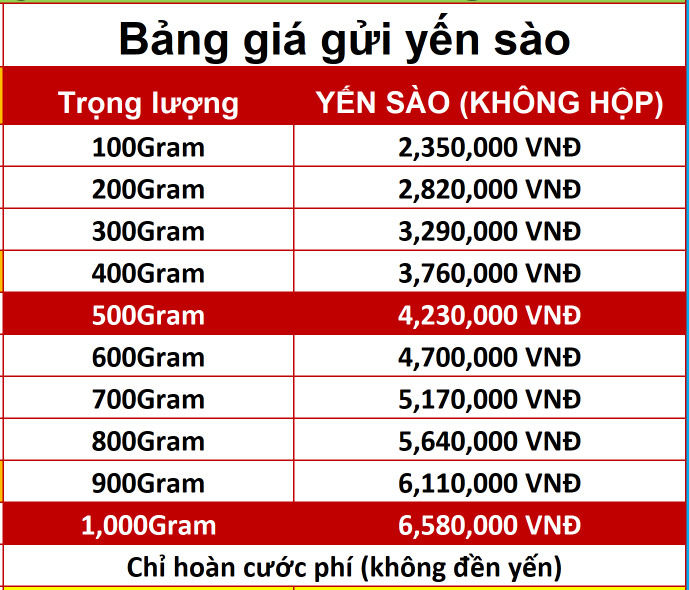 - Bảng giá gửi yến sào đi Mỹ này sẽ hoàn trả cước phí